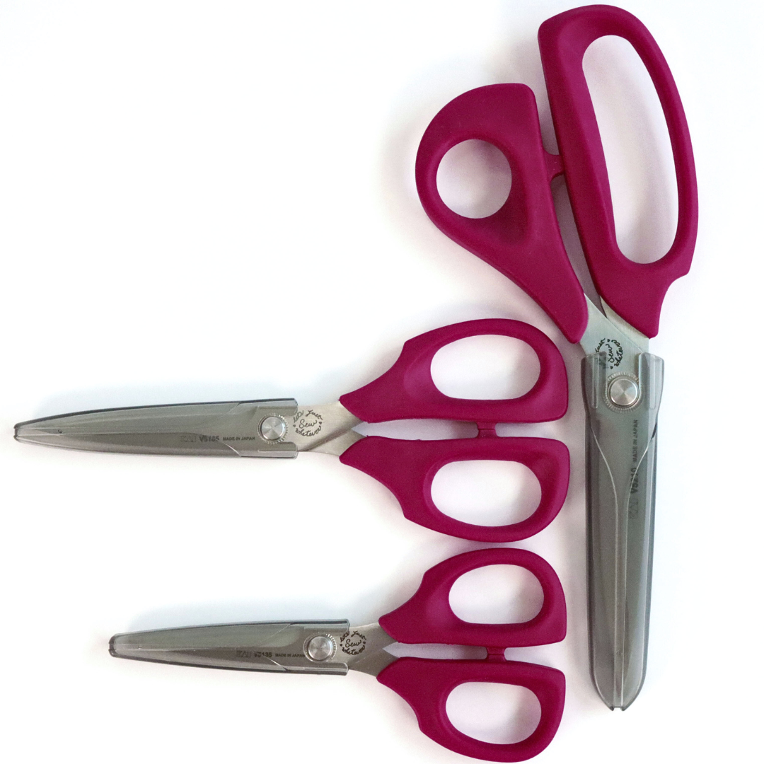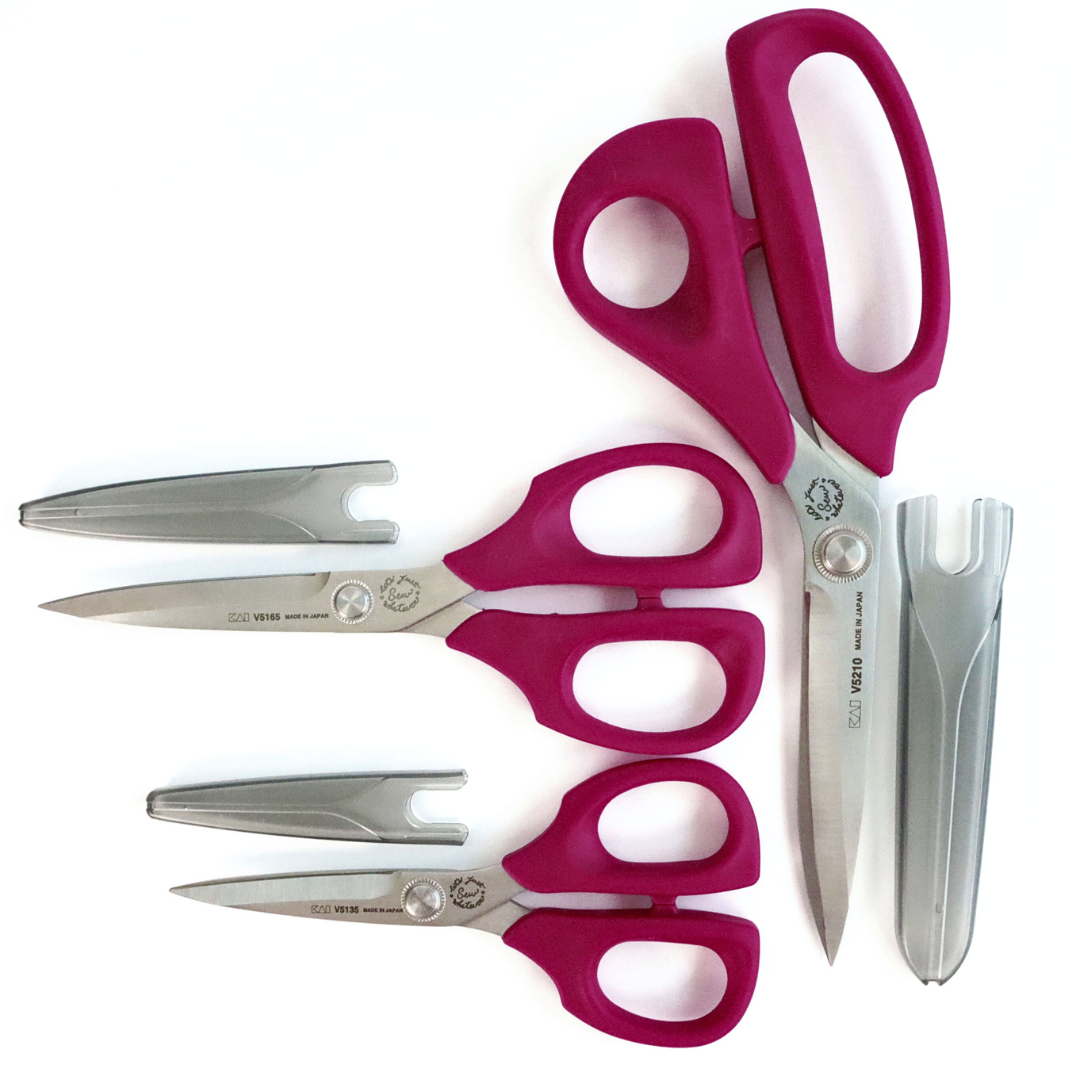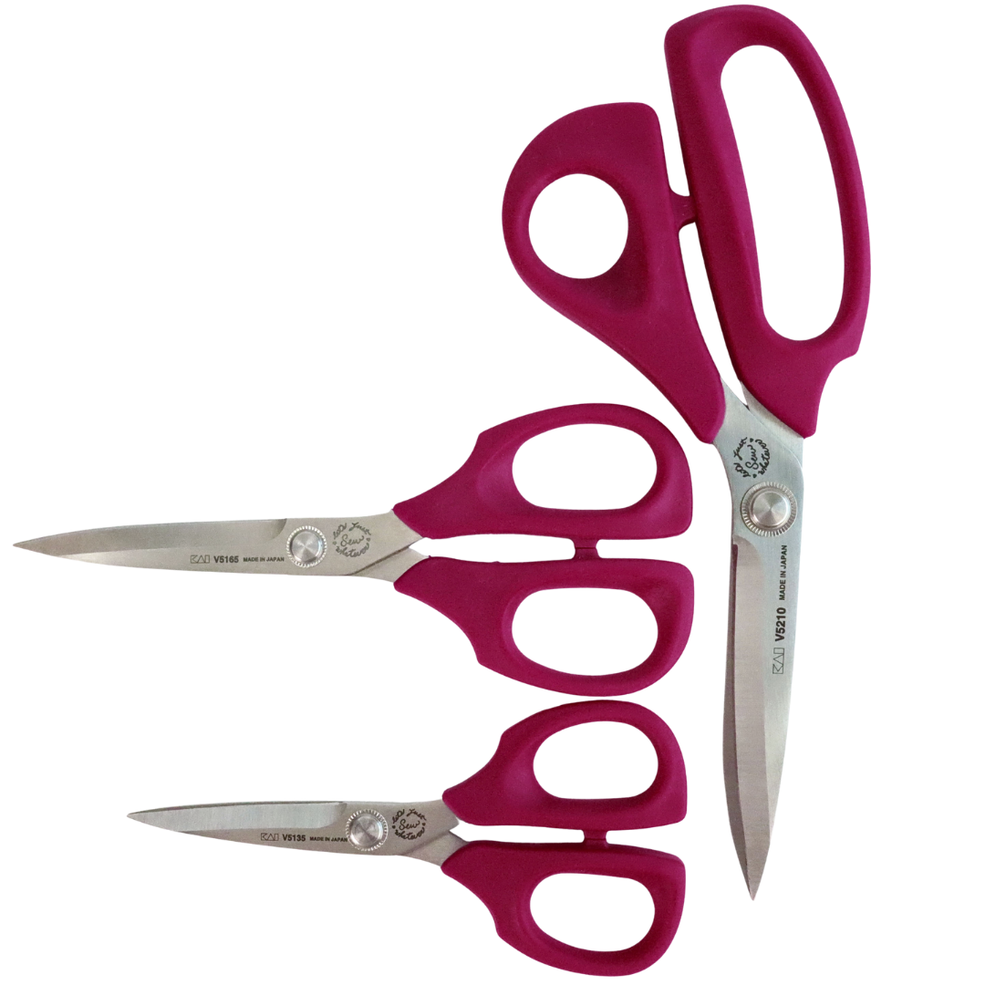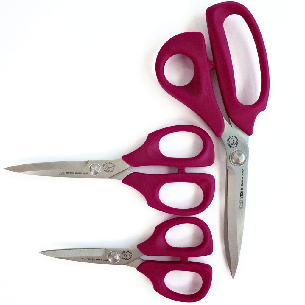 The Kai VERY BERRY Set includes berry colored handles for a trendy, modern look. The smooth, sharp blades give the Kai scissors an amazing smoothness in cut and feel.  Whether it is for a friend, family member, or even yourself, this is the premier gift set for those seeking out performance-level scissors.   This set includes: 1 pair of V5135 (5 1/2" Sewing Scissors):  Quilters love this size for trimming "dog ears" and clipping threads when chain piecing. This smooth, comfortable scissor is perfect in your sewing kit for take along projects and sewing classes. 1 pair of V5165 (6 1/2" Sewing Scissors): Versatile sewing scissors for general trimming on fabrics of all weights. Perfect for cutting fusible applique pieces and trimming seam allowances. 1 pair of V5210 (8" Dressmaking Shears): These 8-inch scissors have ergonomically soft handles which allow fatigue-free cutting on all types of fabric. Cuts multiple layers of denim with ease while trimming cottons without any fabric slippage. The Kai V5210 is the standard size handle and blade length.  All Scissors are Made in Japan