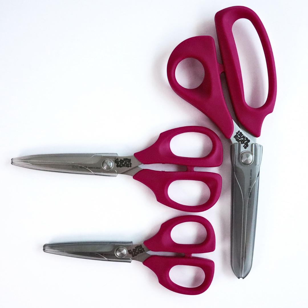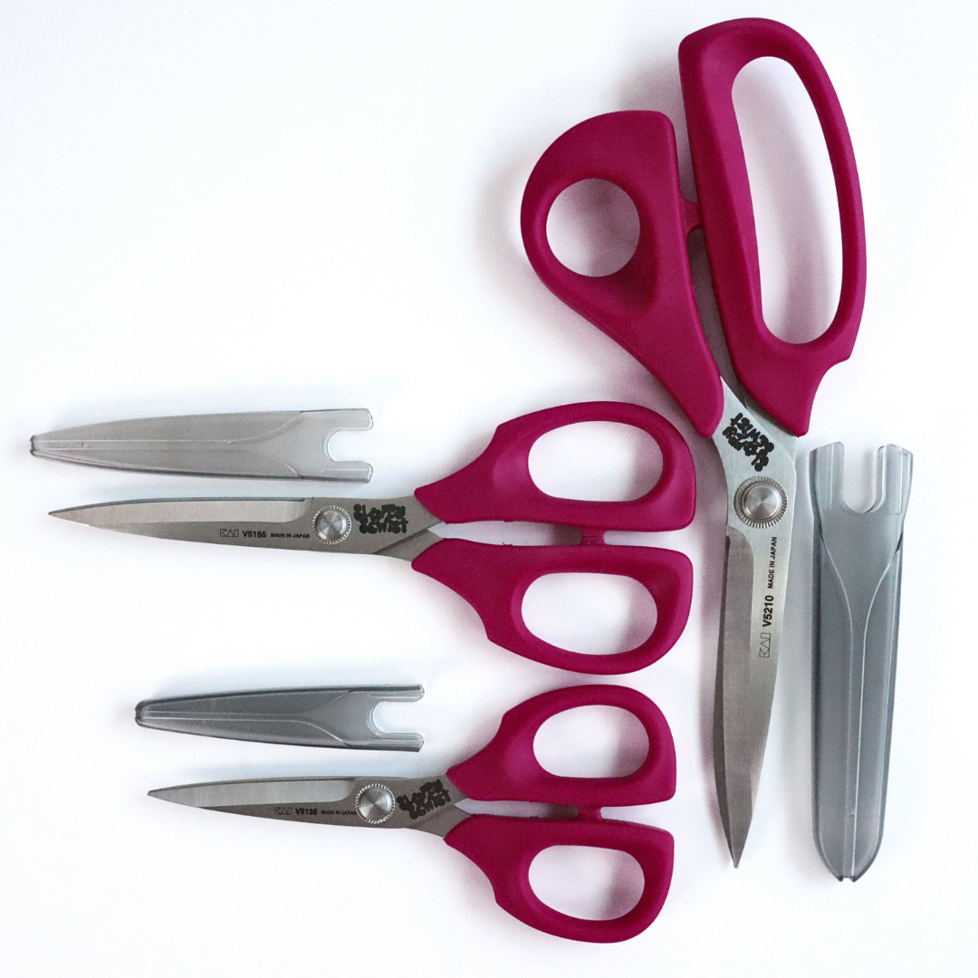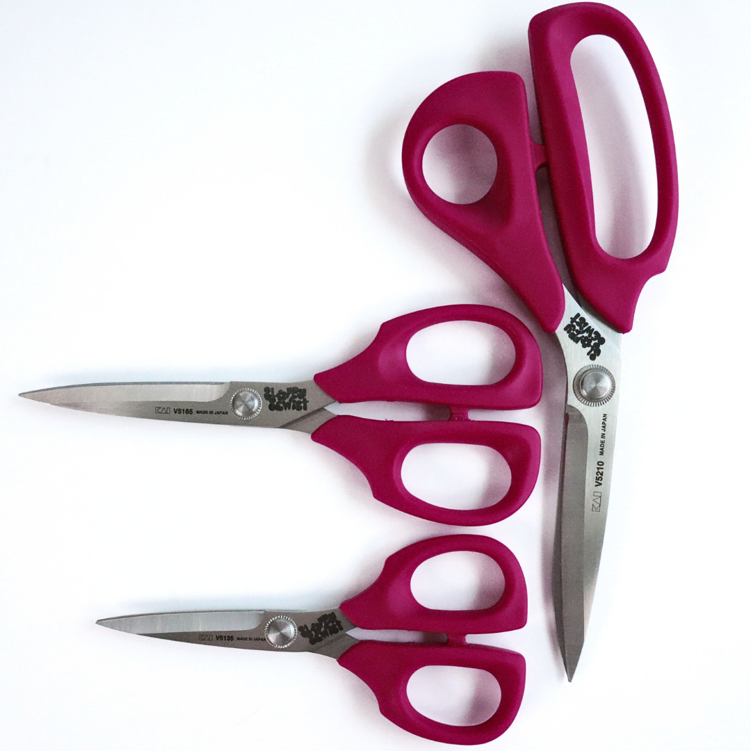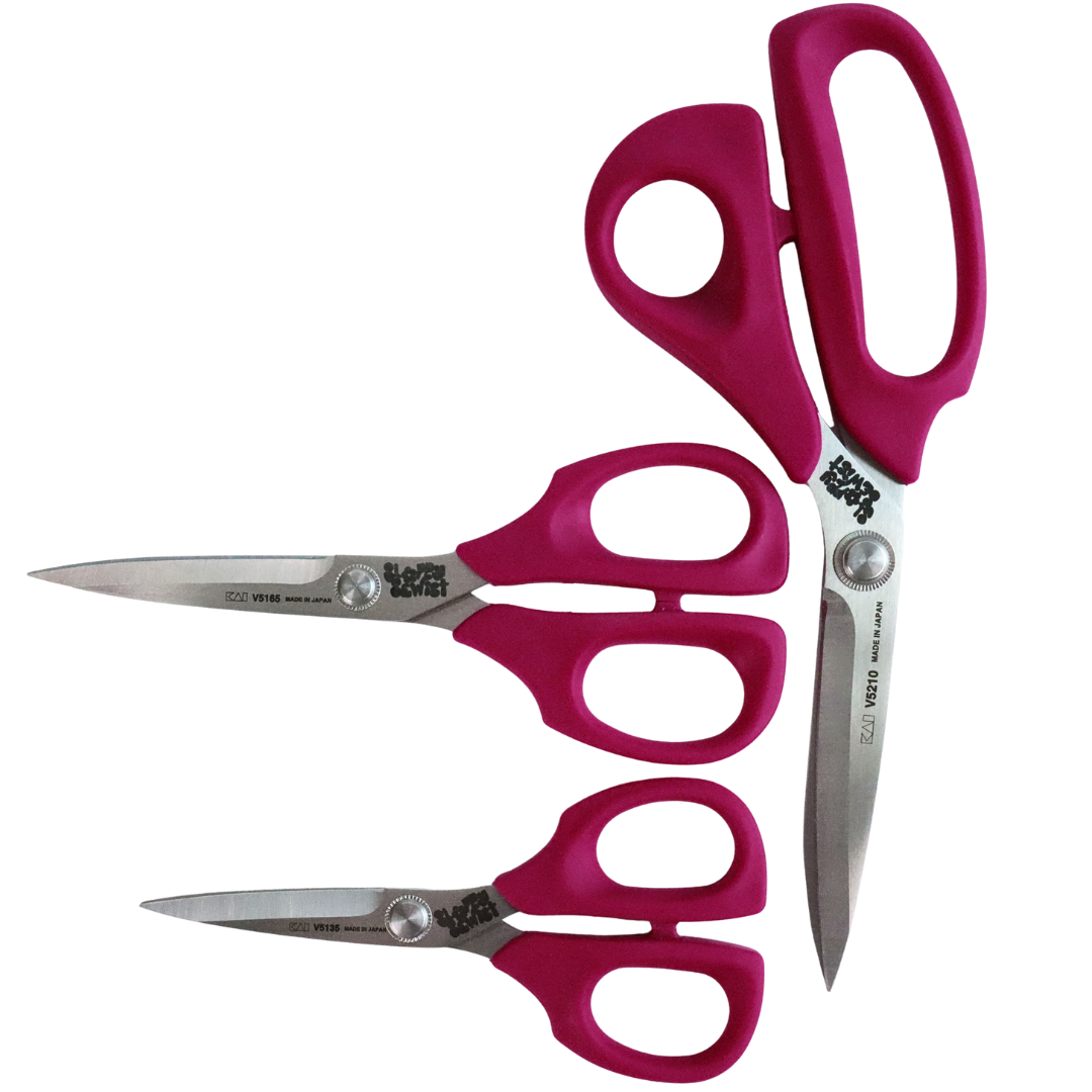 The Kai VERY BERRY Set includes berry colored handles for a trendy, modern look. The smooth, sharp blades give the Kai scissors an amazing smoothness in cut and feel. Whether it is for a friend, family member, or even yourself, this is the premier gift set for those seeking out performance-level scissors. This set includes: 1 pair of V5135 (5 1/2" Sewing Scissors): Quilters love this size for trimming "dog ears" and clipping threads when chain piecing. This smooth, comfortable scissor is perfect in your sewing kit for take along projects and sewing classes. 1 pair of V5165 (6 1/2" Sewing Scissors): Versatile sewing scissors for general trimming on fabrics of all weights. Perfect for cutting fusible applique pieces and trimming seam allowances. 1 pair of V5210 (8" Dressmaking Shears): These 8-inch scissors have ergonomically soft handles which allow fatigue-free cutting on all types of fabric. Cuts multiple layers of denim with ease while trimming cottons without any fabric slippage. The Kai V5210 is the standard size handle and blade length. All Scissors are Made in Japan