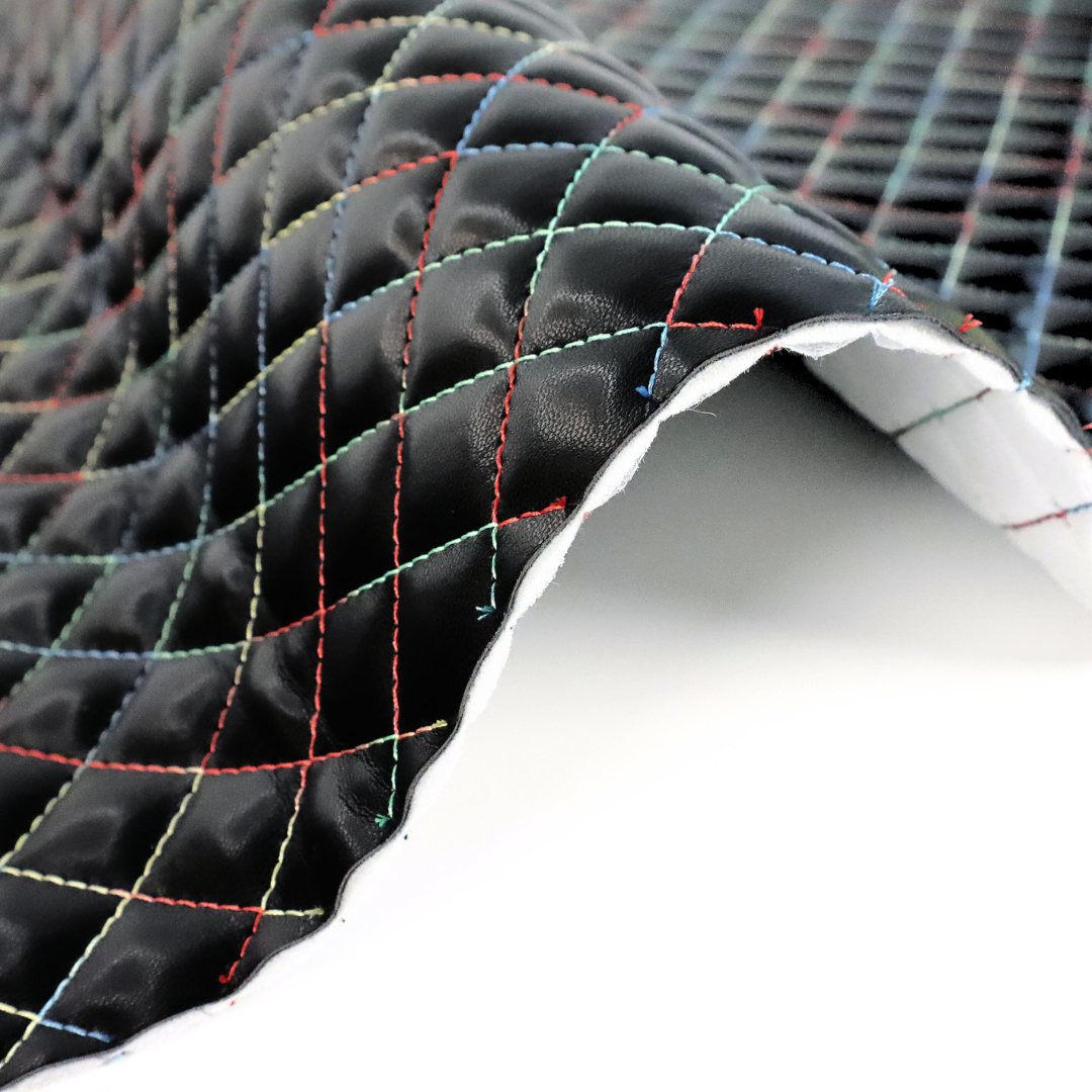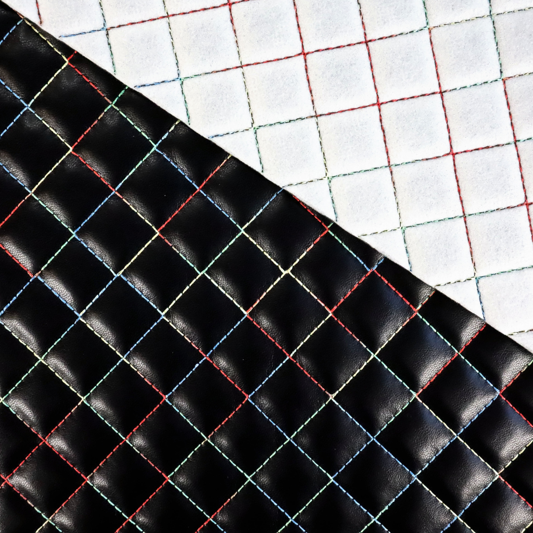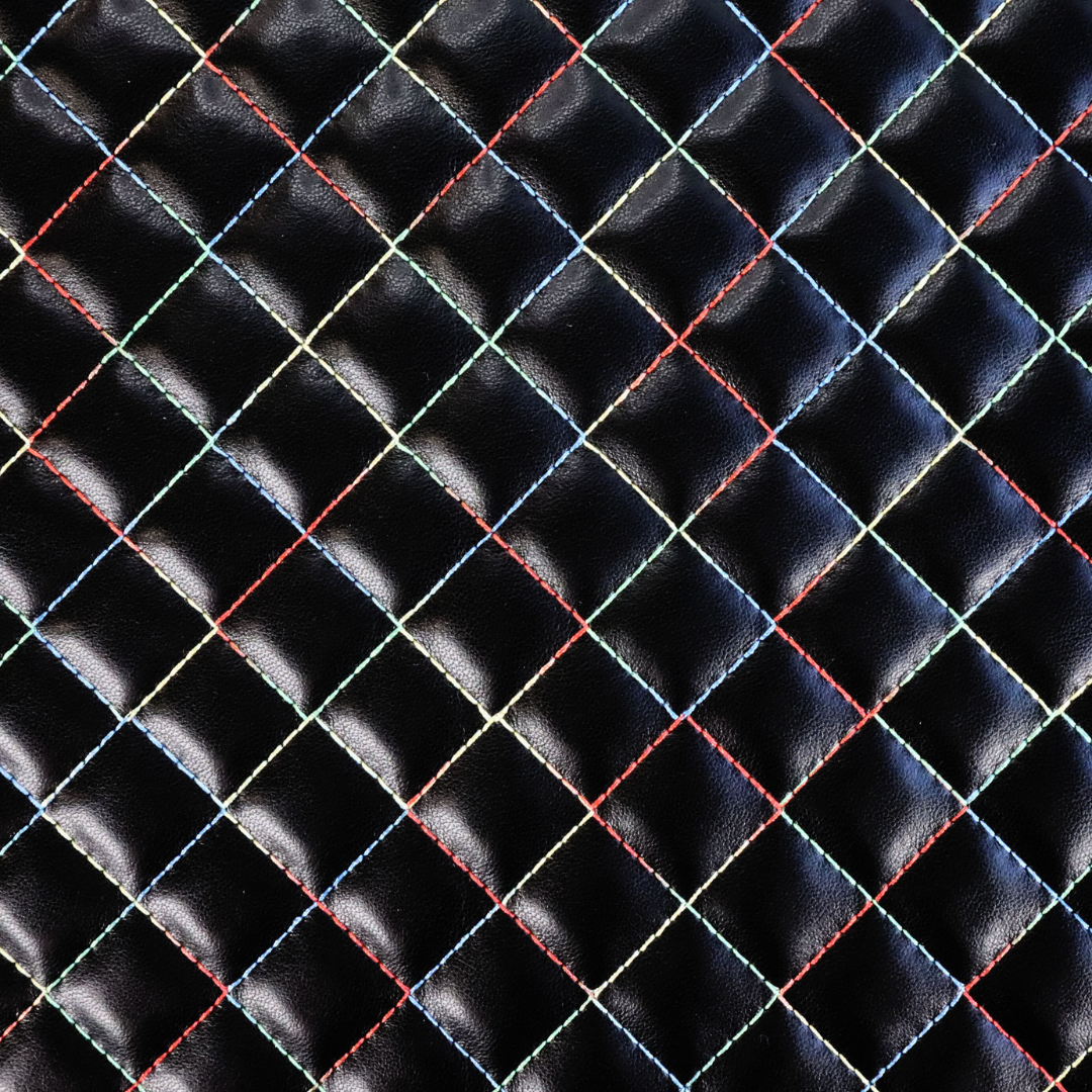 This pre-quilted vinyl is black with rainbow diamond stitching.