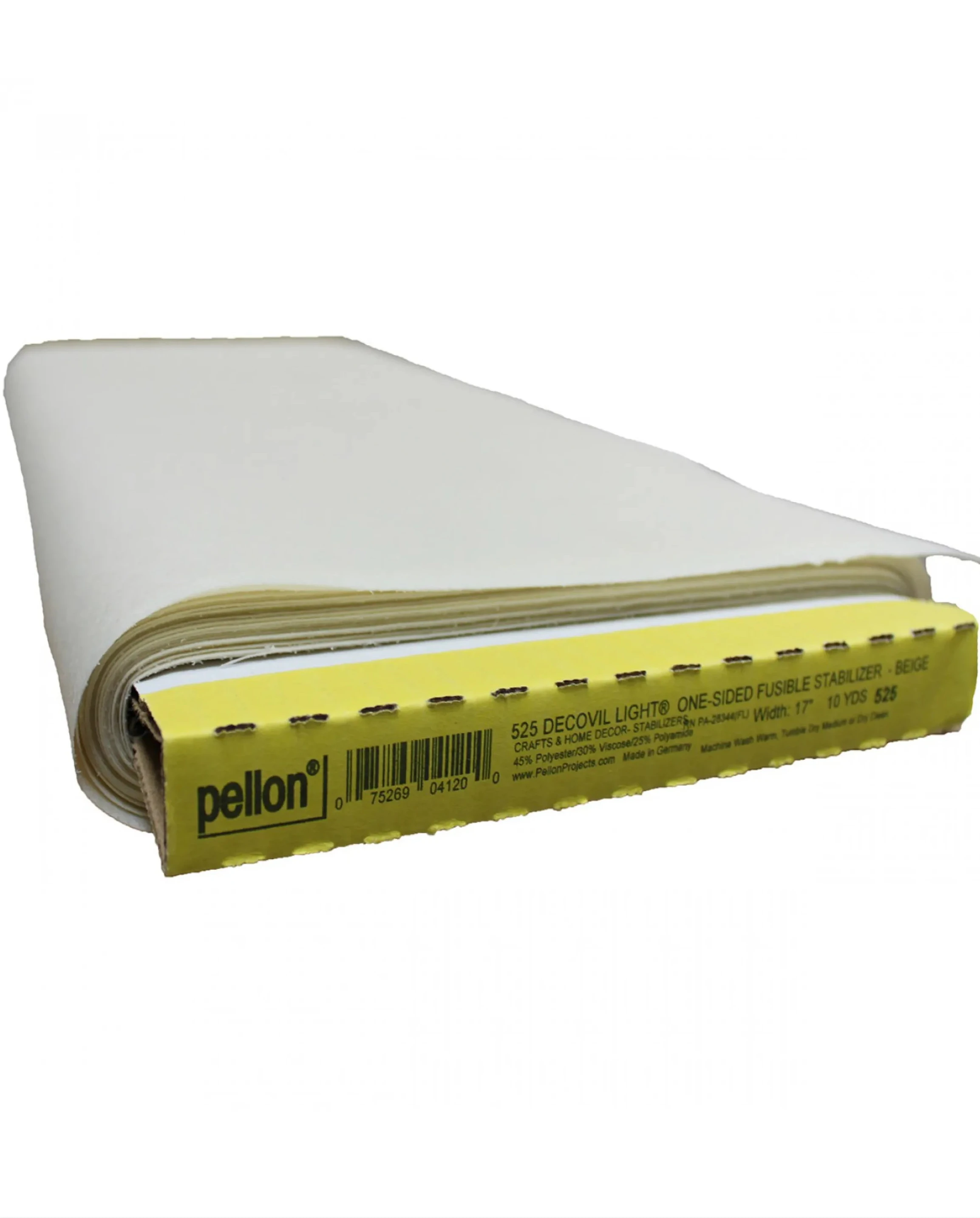 Pellon 525 Decovil Light is a lightweight, softer and more flexible alternative to the 526 Decovil. It is a non-woven iron-on interfacing with a flexible yet leather like handle. It is tear-resistant, but also dimensionally stable and easy to shape. Furthermore it is resilient, resistant to bending, punchable and the cutting edges suited for the creation of hats, belts, bags and small fabric bowls as well as home decor projects. Easy to sew and great for use with synthetic or natural fabrics. 17" wide