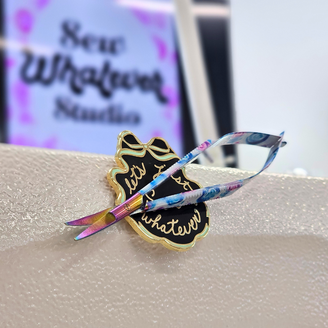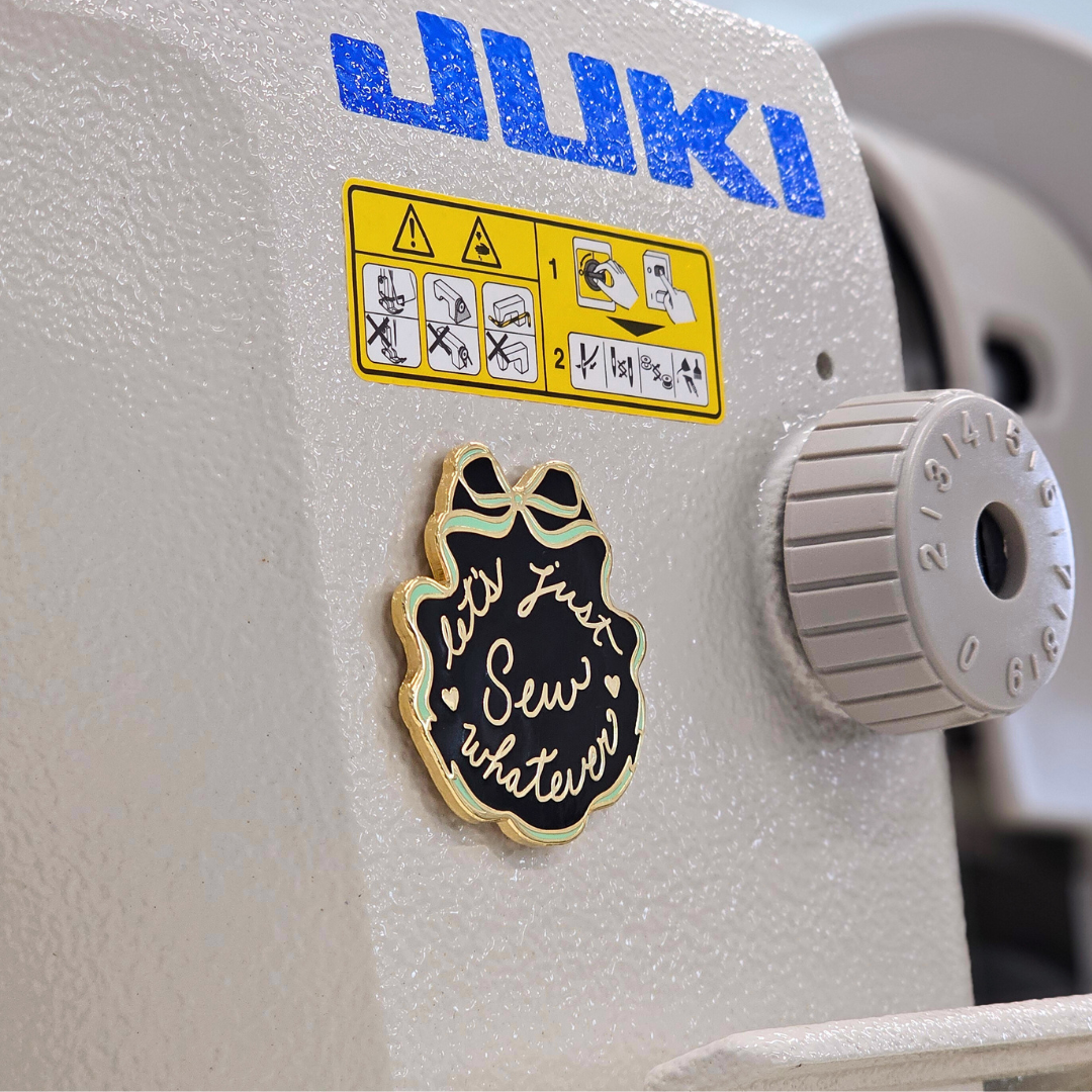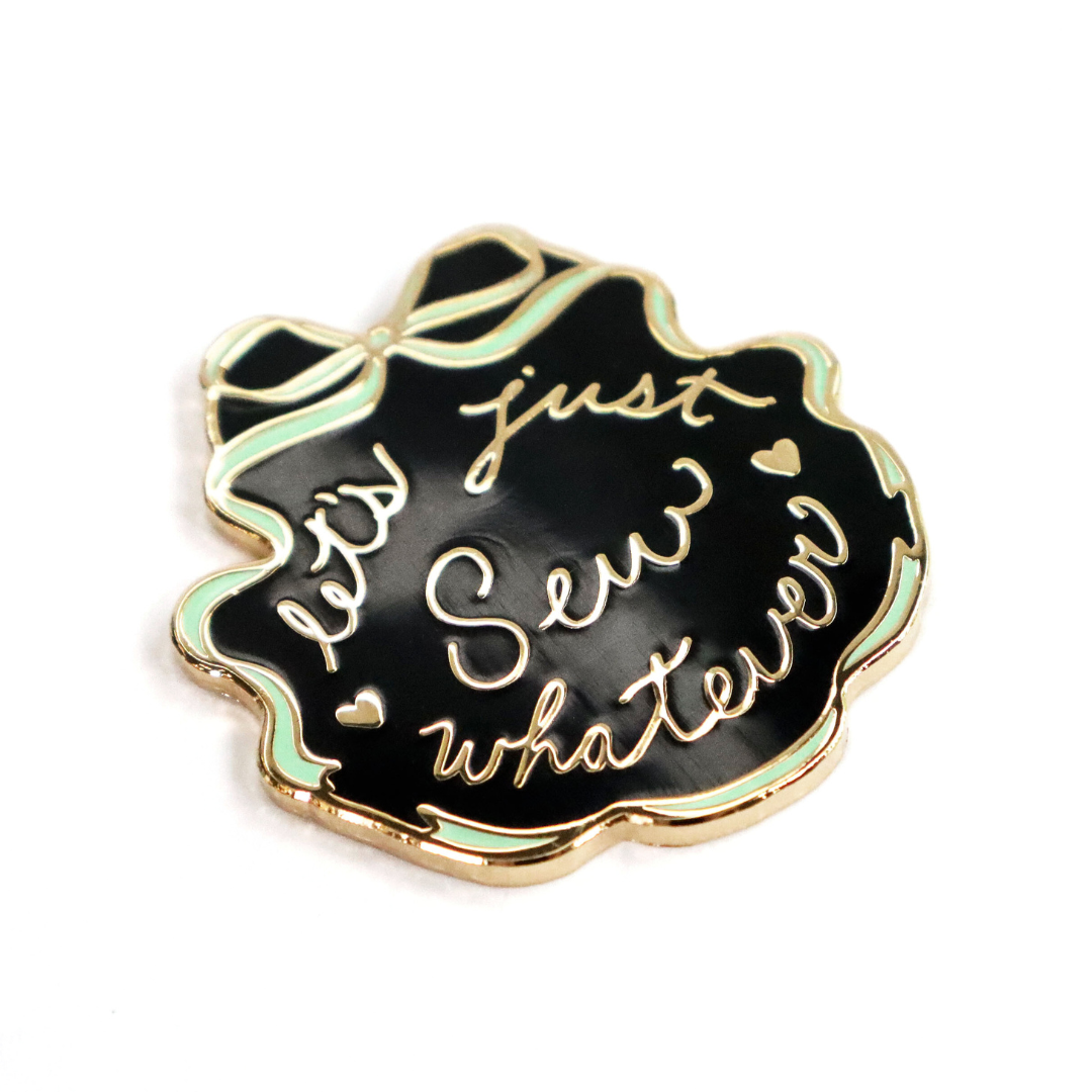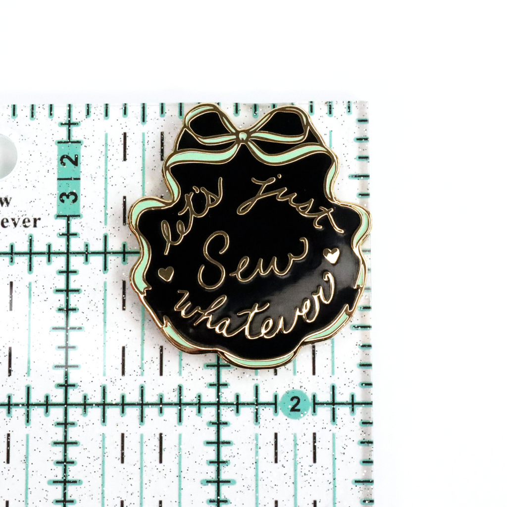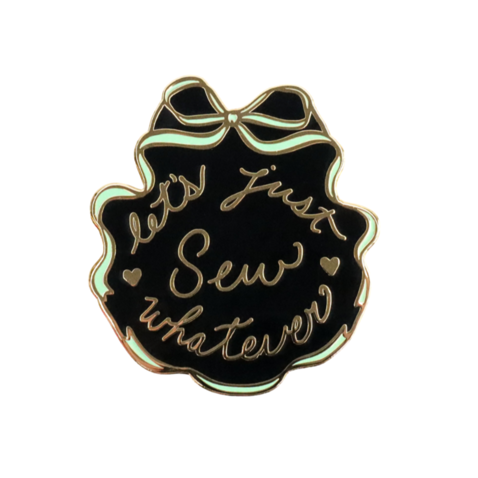 A hard enamel machine magnet designed with Lauren Mormino's "Let's Just Sew Whatever" slogan framed inside a mint colored bow. 𐙚