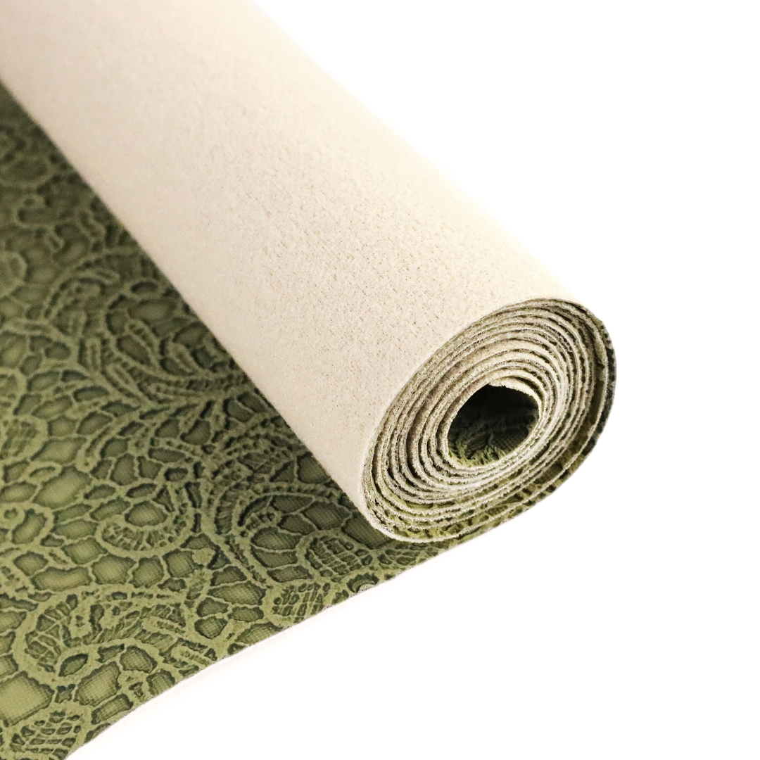 This lace vinyl roll is a paler neutral shade of green with a yellow undertone.