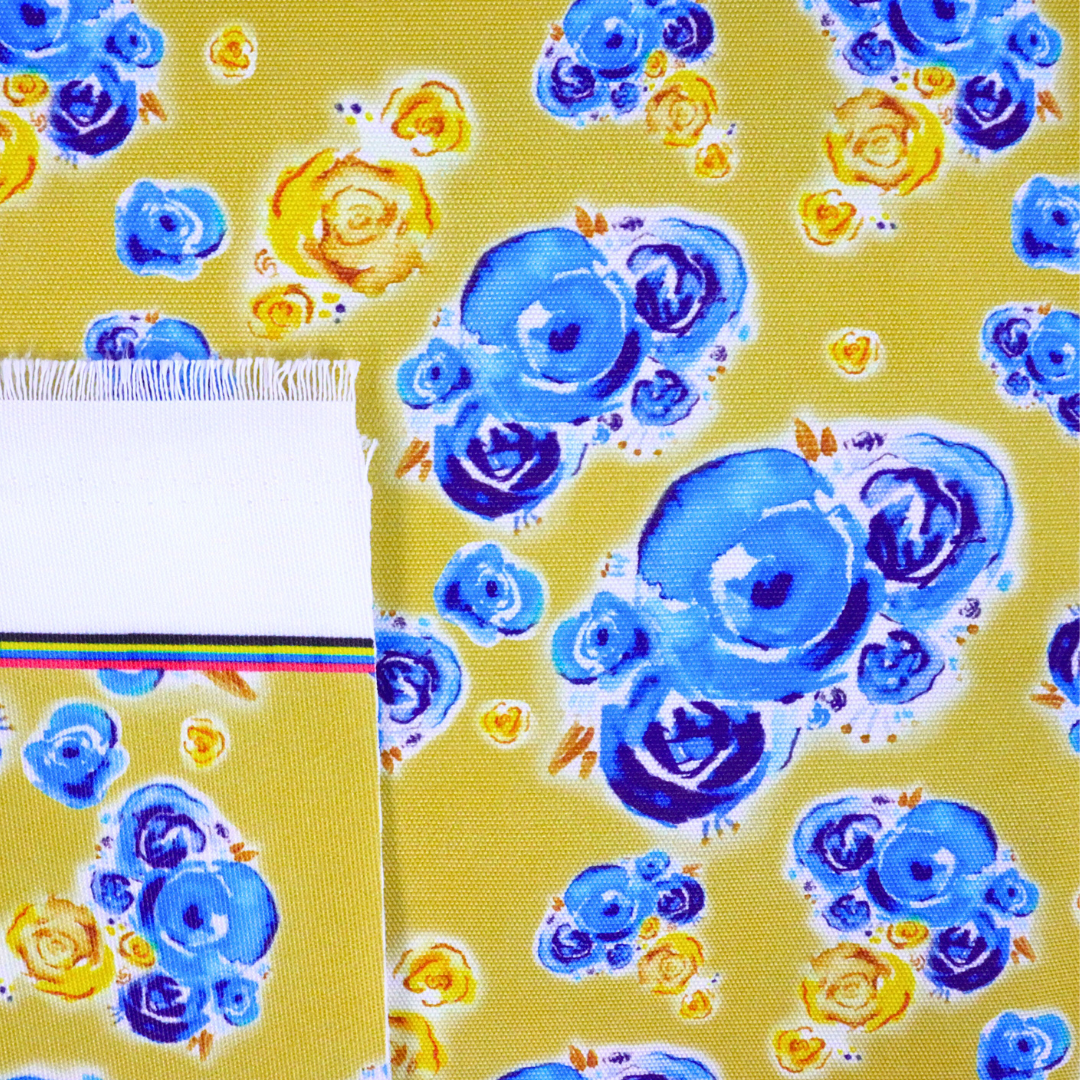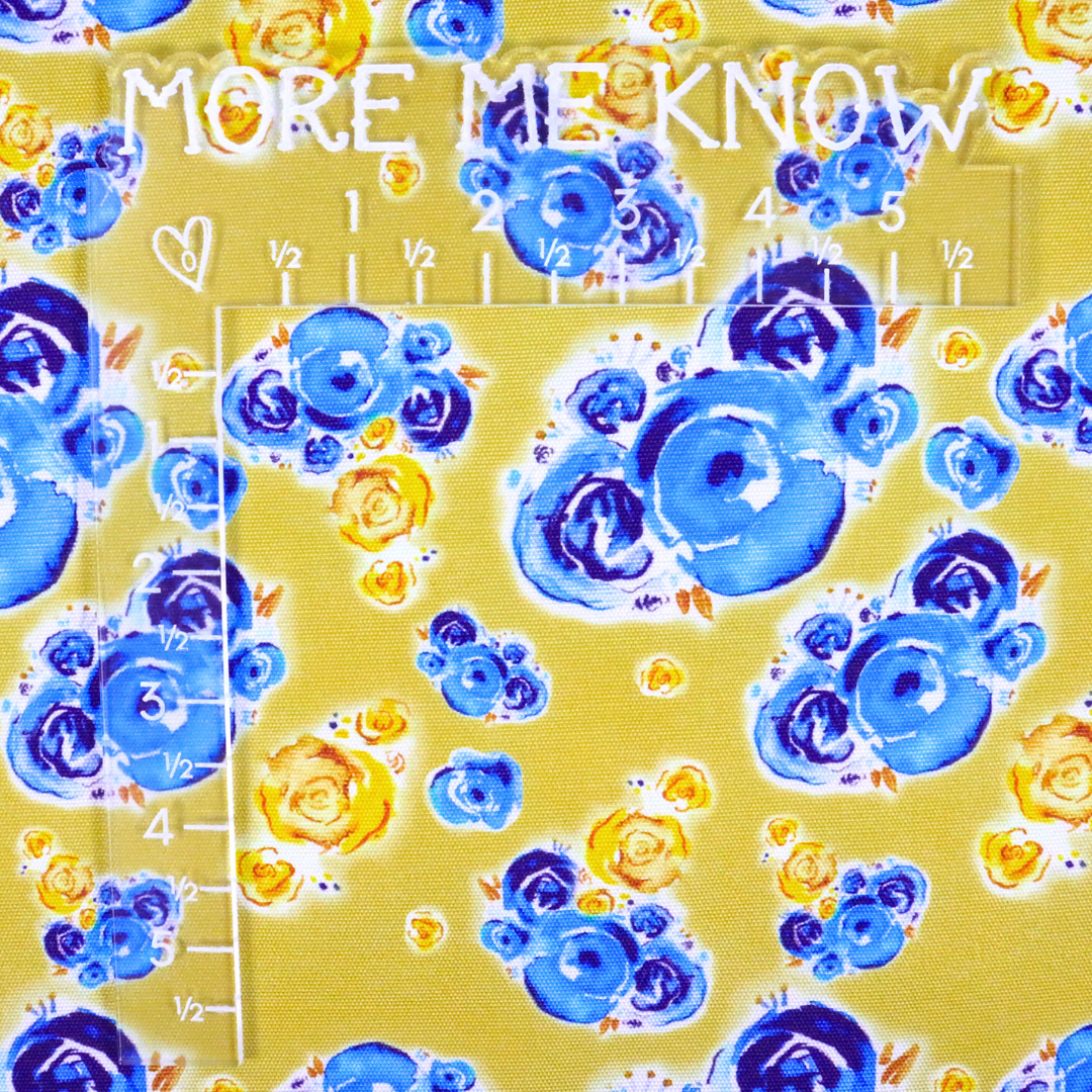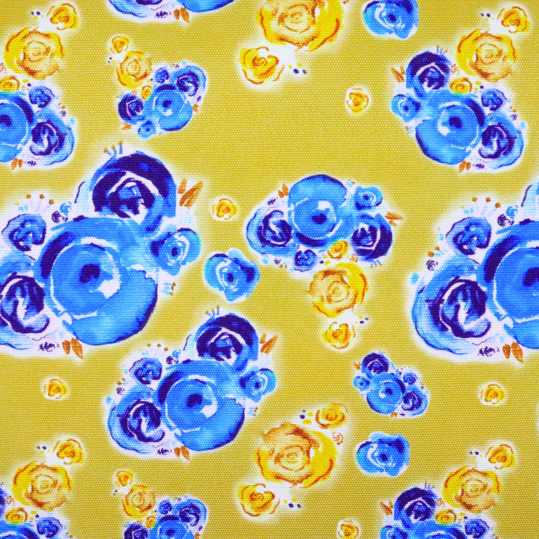 This ReNew Canvas print is of Lauren Mormino's original watercolor rose design in the "Kitchen Floral" color variation (blue and yellow flowers on a deep yellow background).