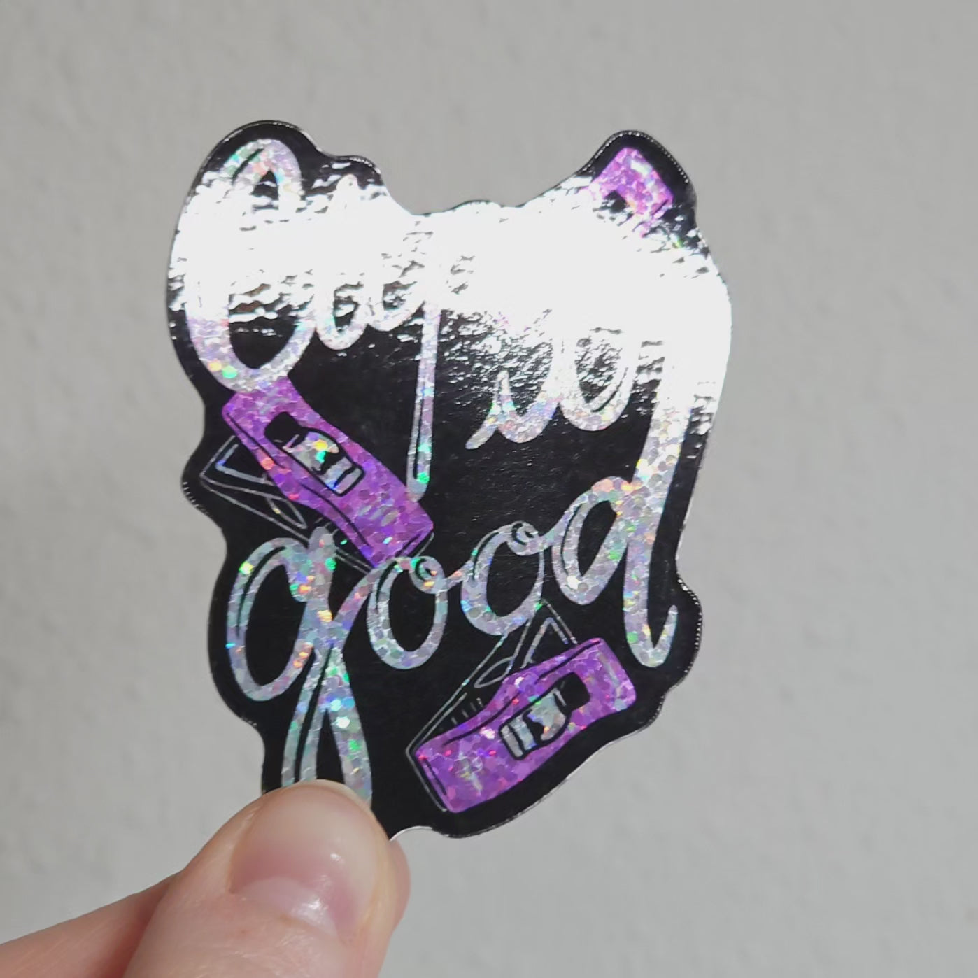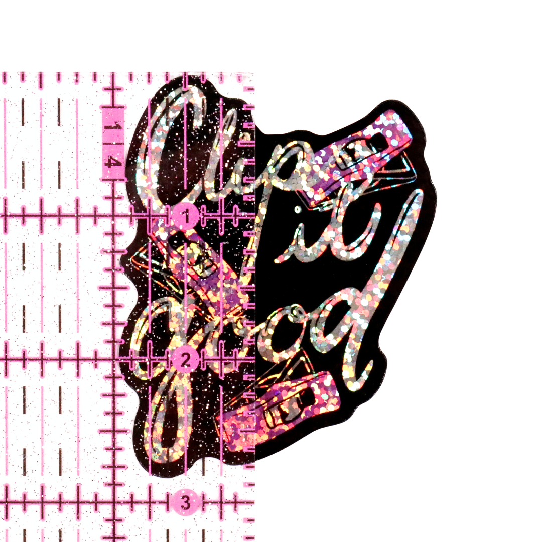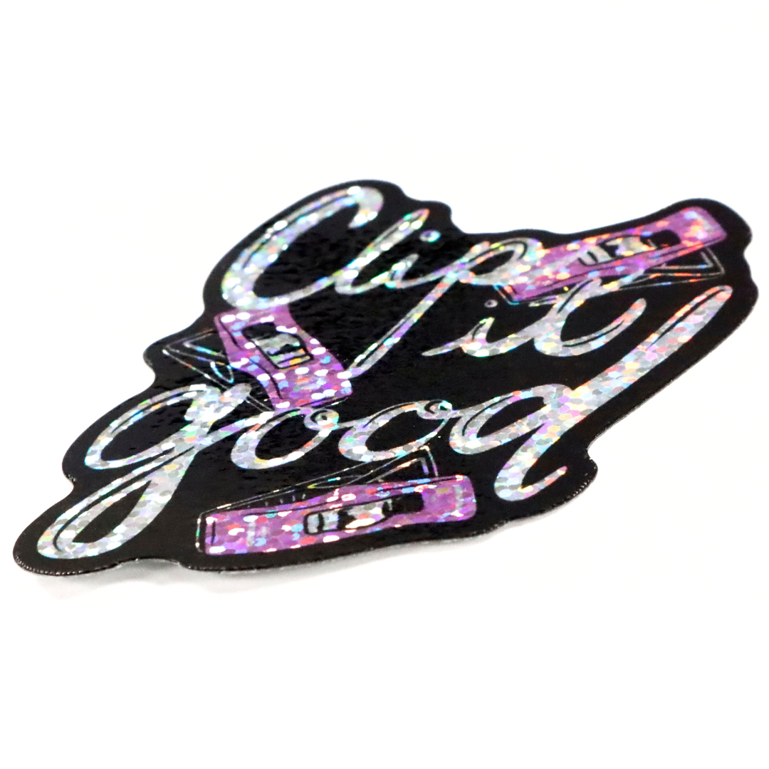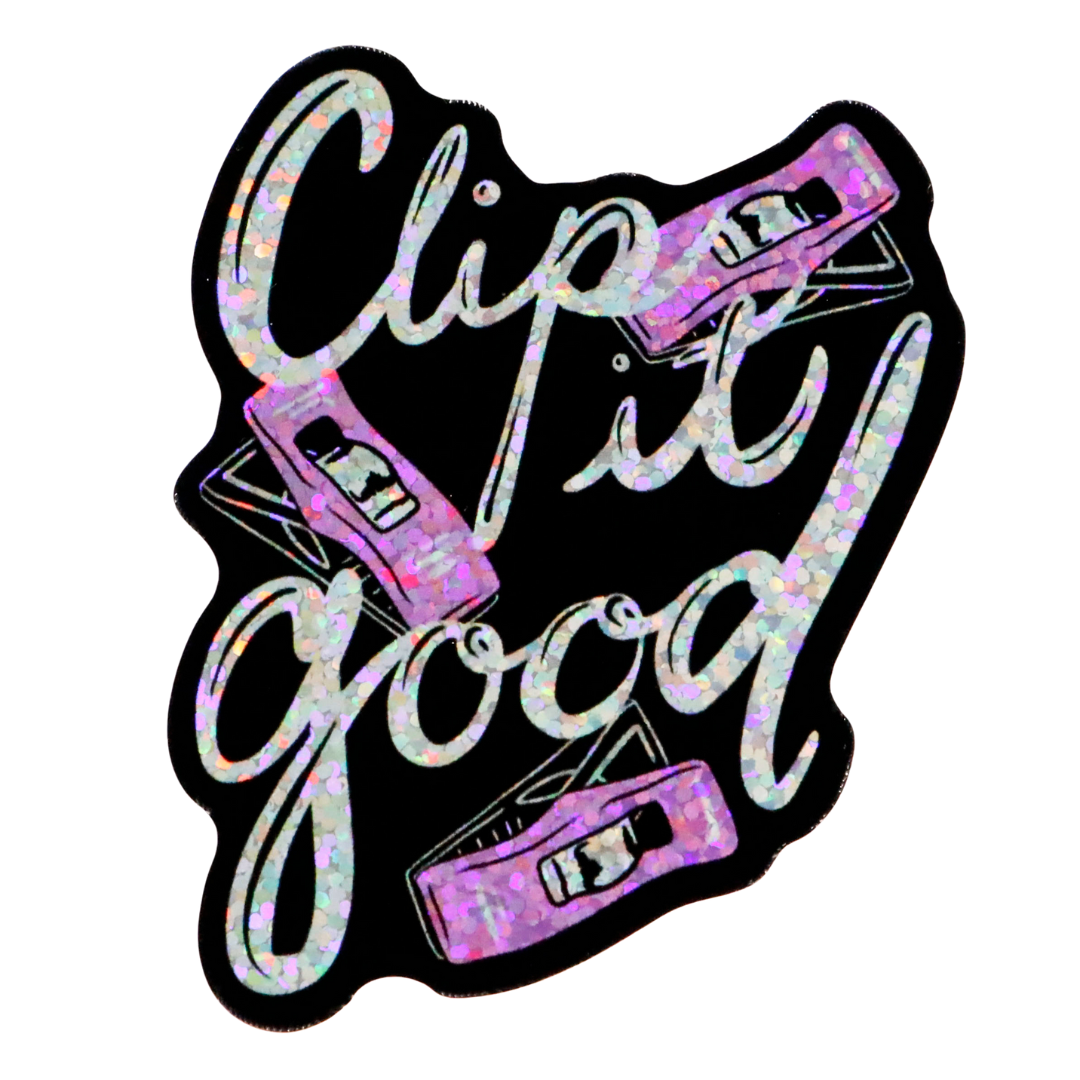 A glossy holographic glitter sticker with Lauren's "Clip it Good" quote. It has a black background with 3 purple glitter clips drawn by Lauren Mormino.