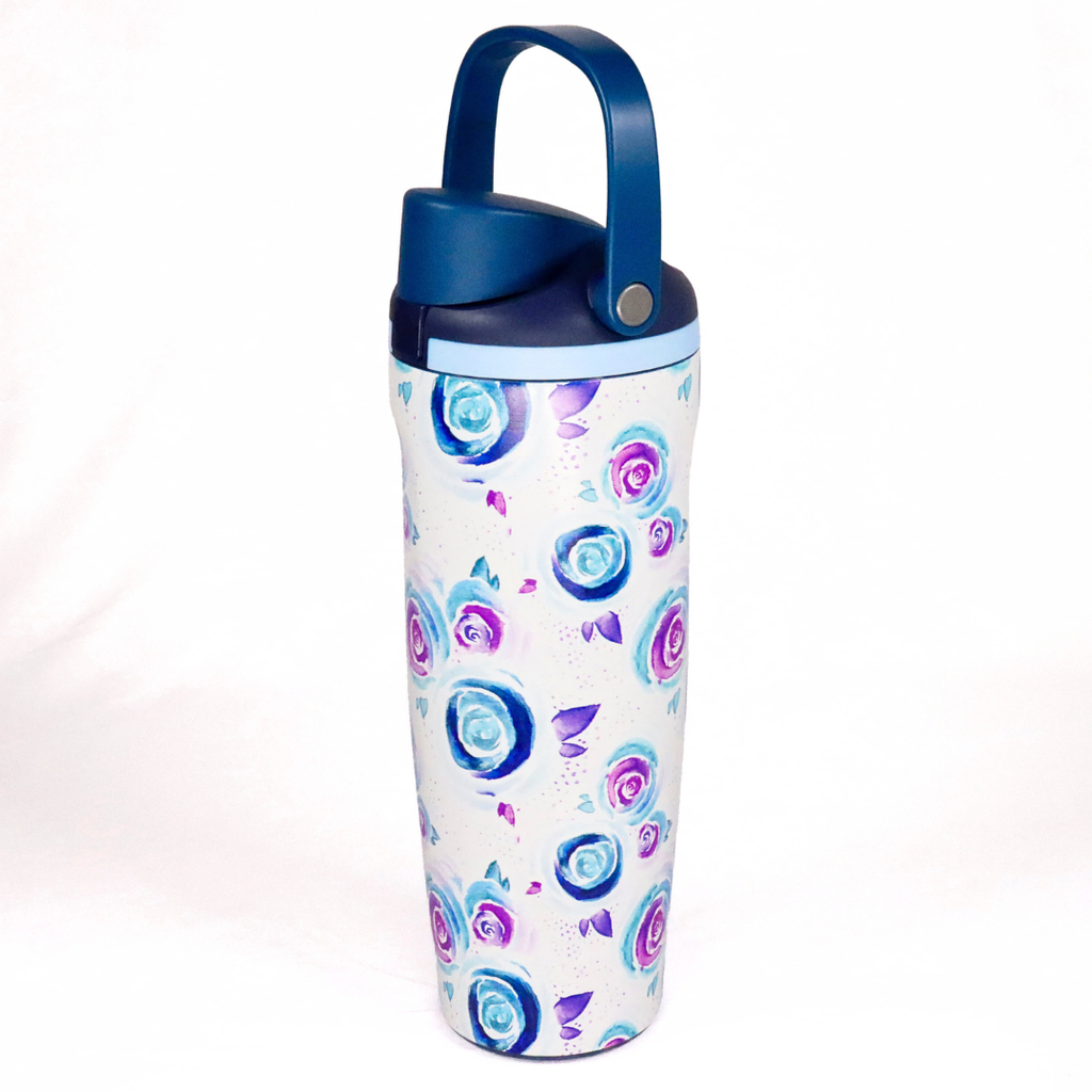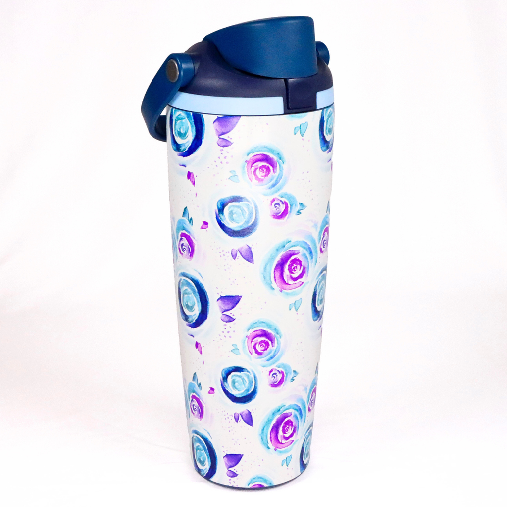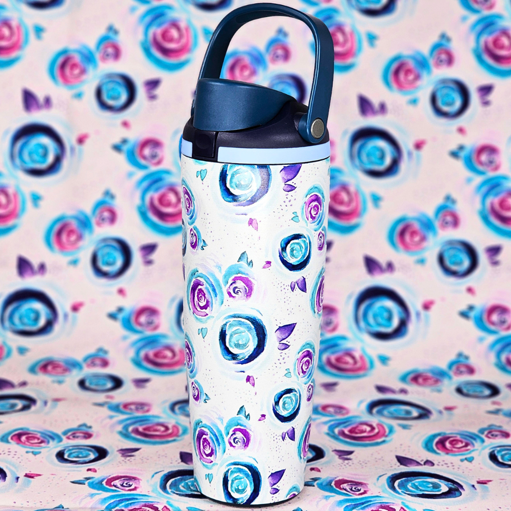 An insulated 30 oz stainless-steel water bottle printed with Lauren Mormino's original "Watercolor Roses" design.