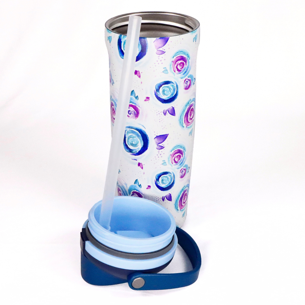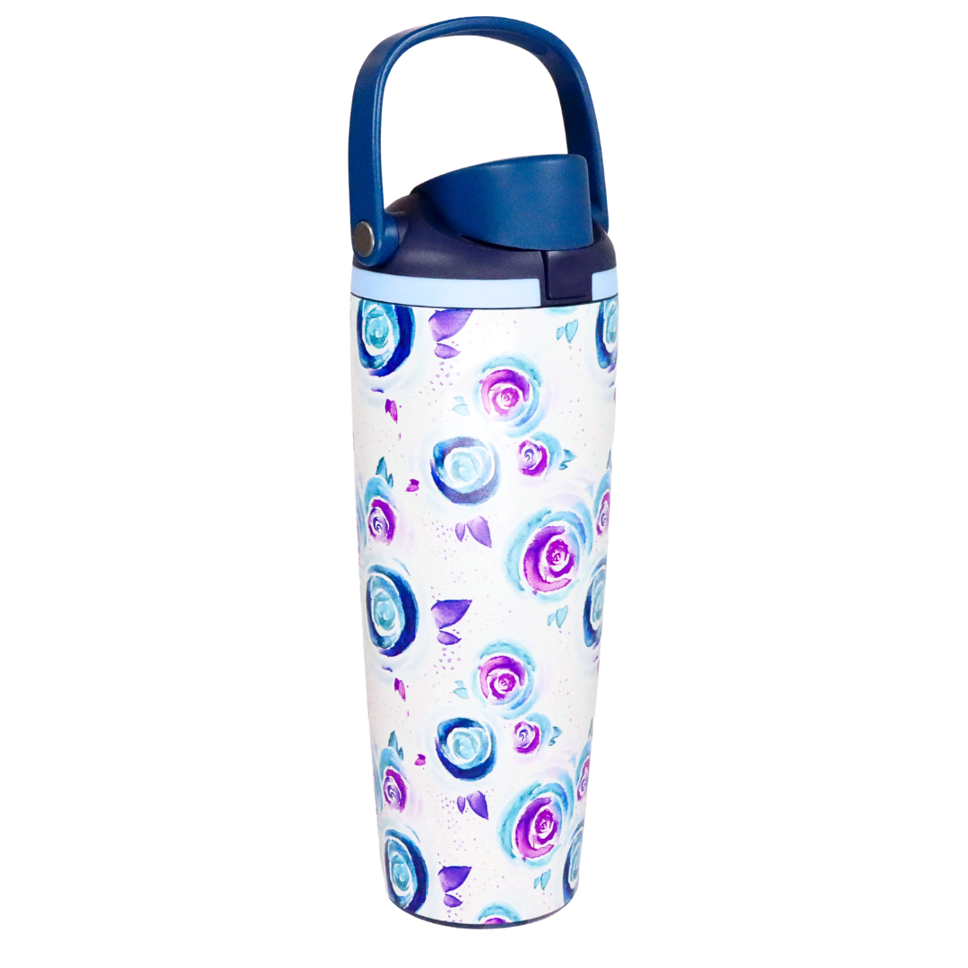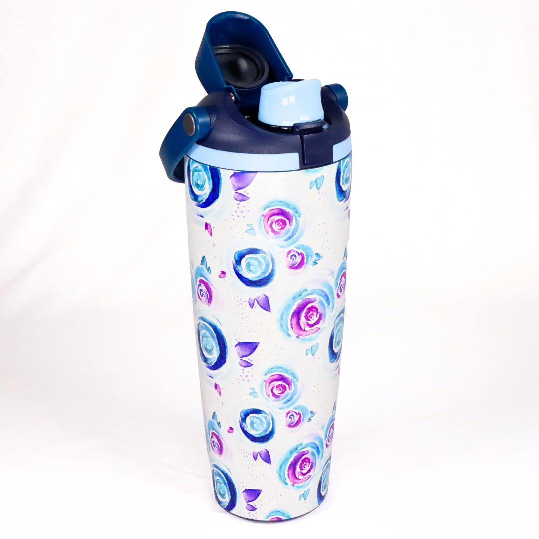 An insulated 30 oz stainless-steel water bottle printed with Lauren Mormino's original "Watercolor Roses" design.