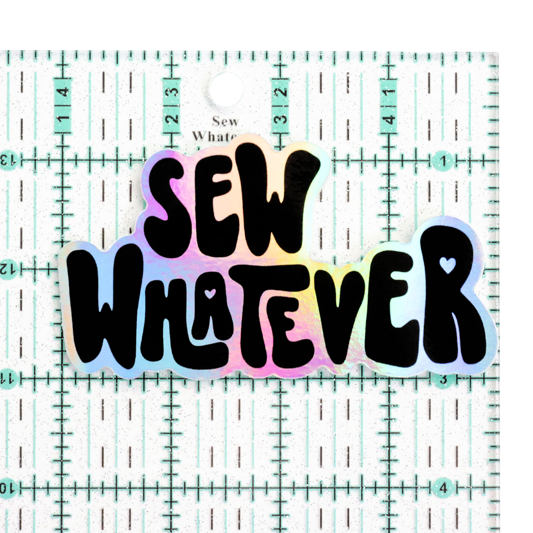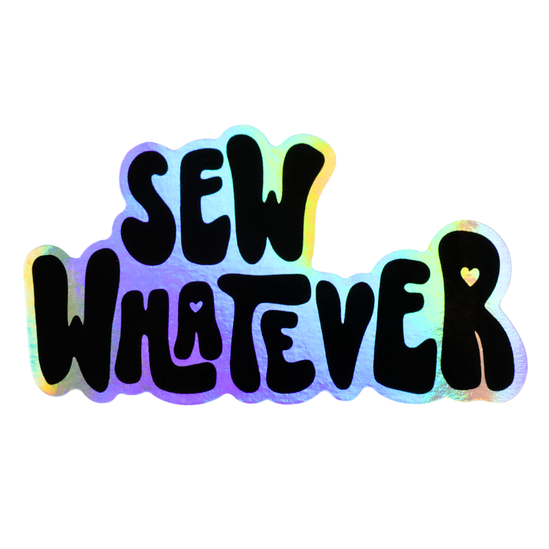 Hand drawn letters that say "Sew Whatever" with heart details over a holographic backdrop.