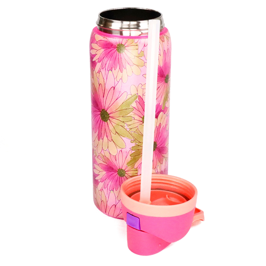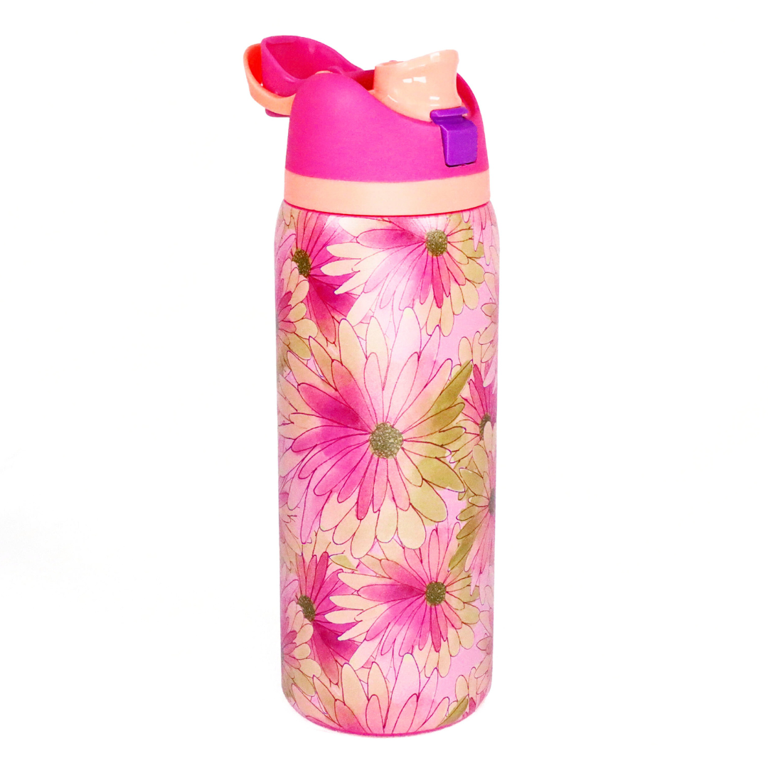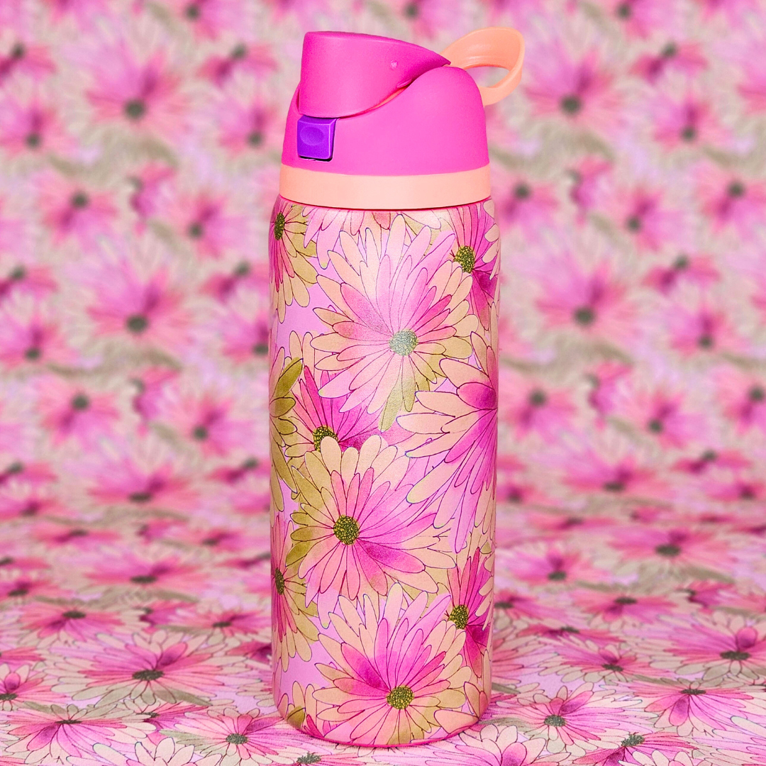An insulated 32 oz stainless-steel water bottle printed with Lauren Mormino's "Sunrise Daisy" design. ☀️🌼
