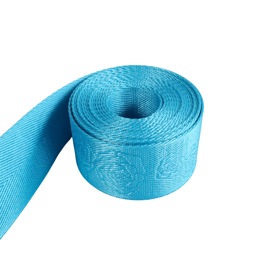 Debossed rose webbing in a shiny light blue.