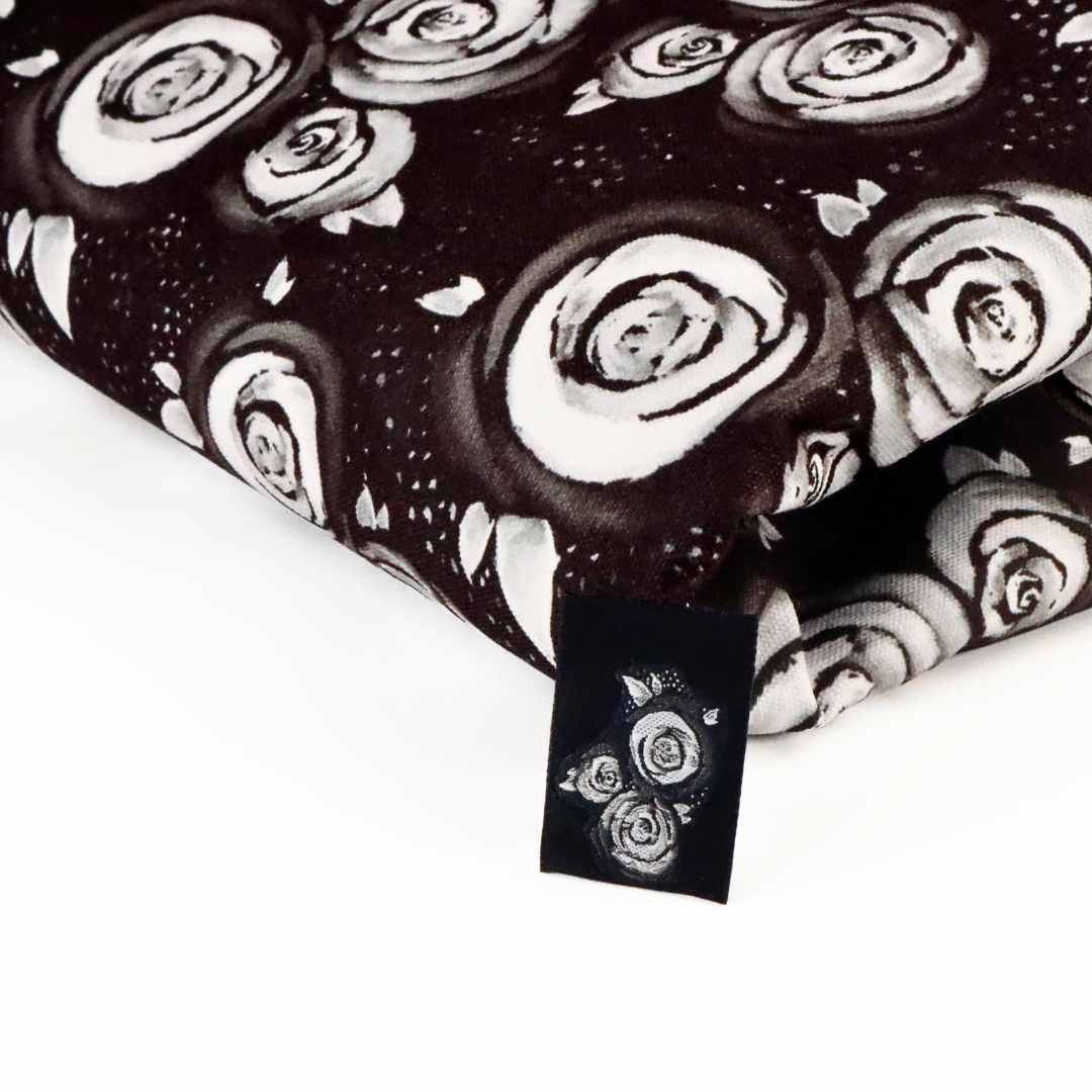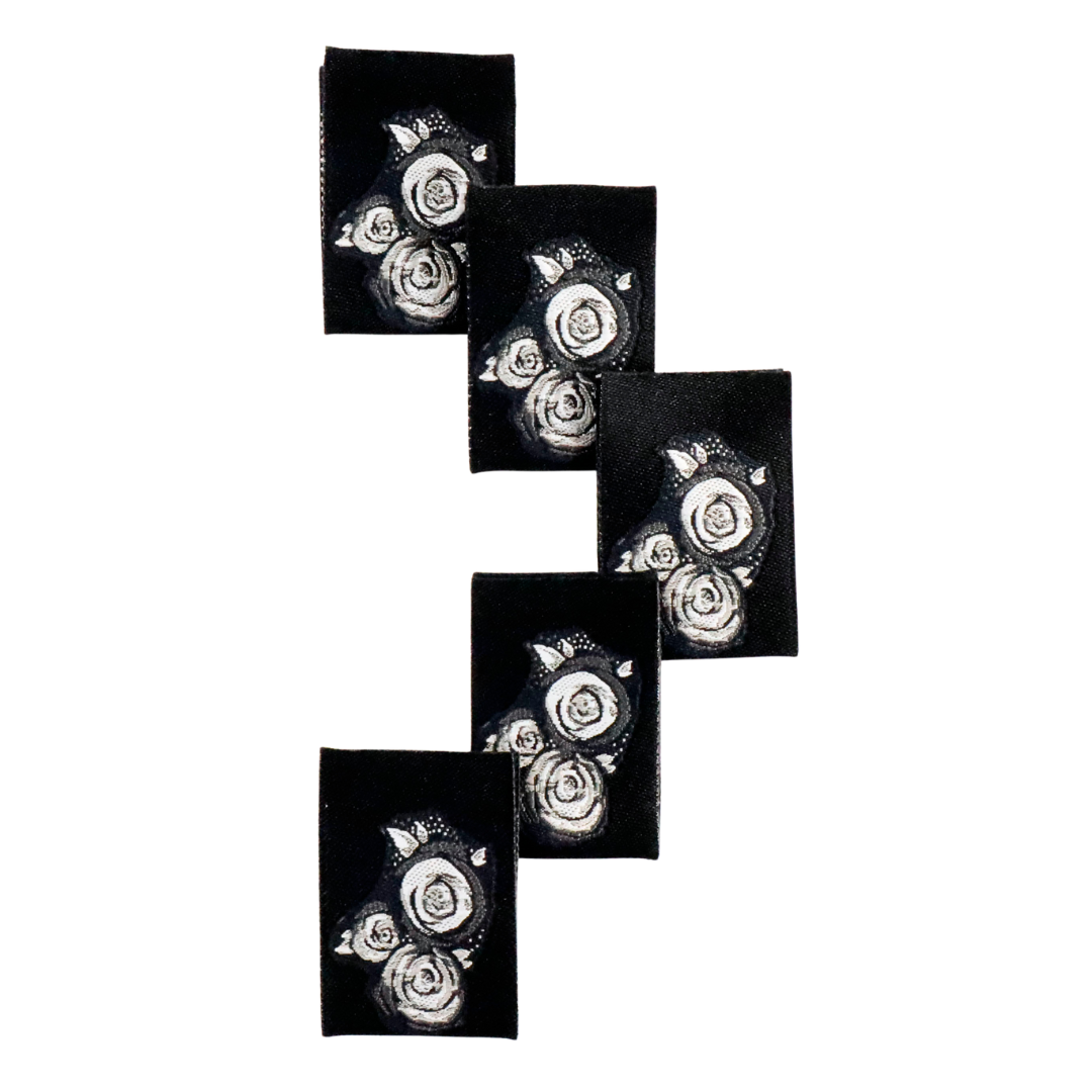 5 pack of black and white woven labels of Lauren Mormino's "Chalkboard Roses" print.
