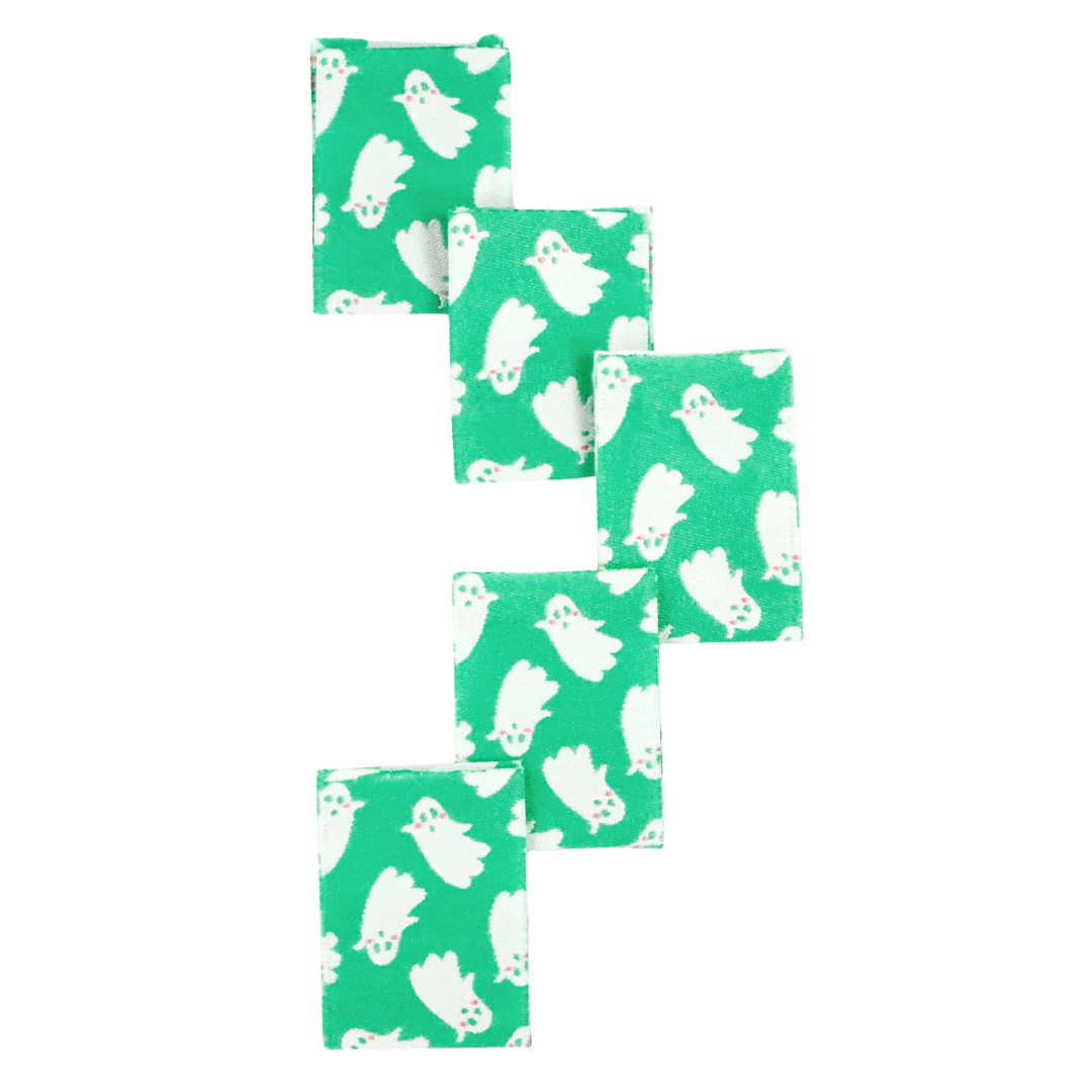5 pack of bright green woven labels of Lauren Mormino's "Waving Ghosts" print.