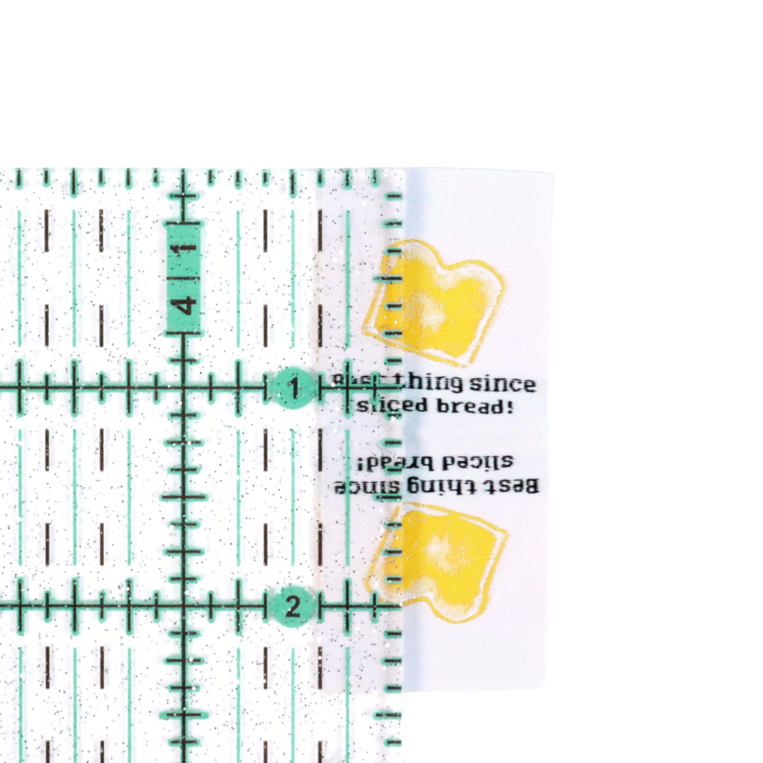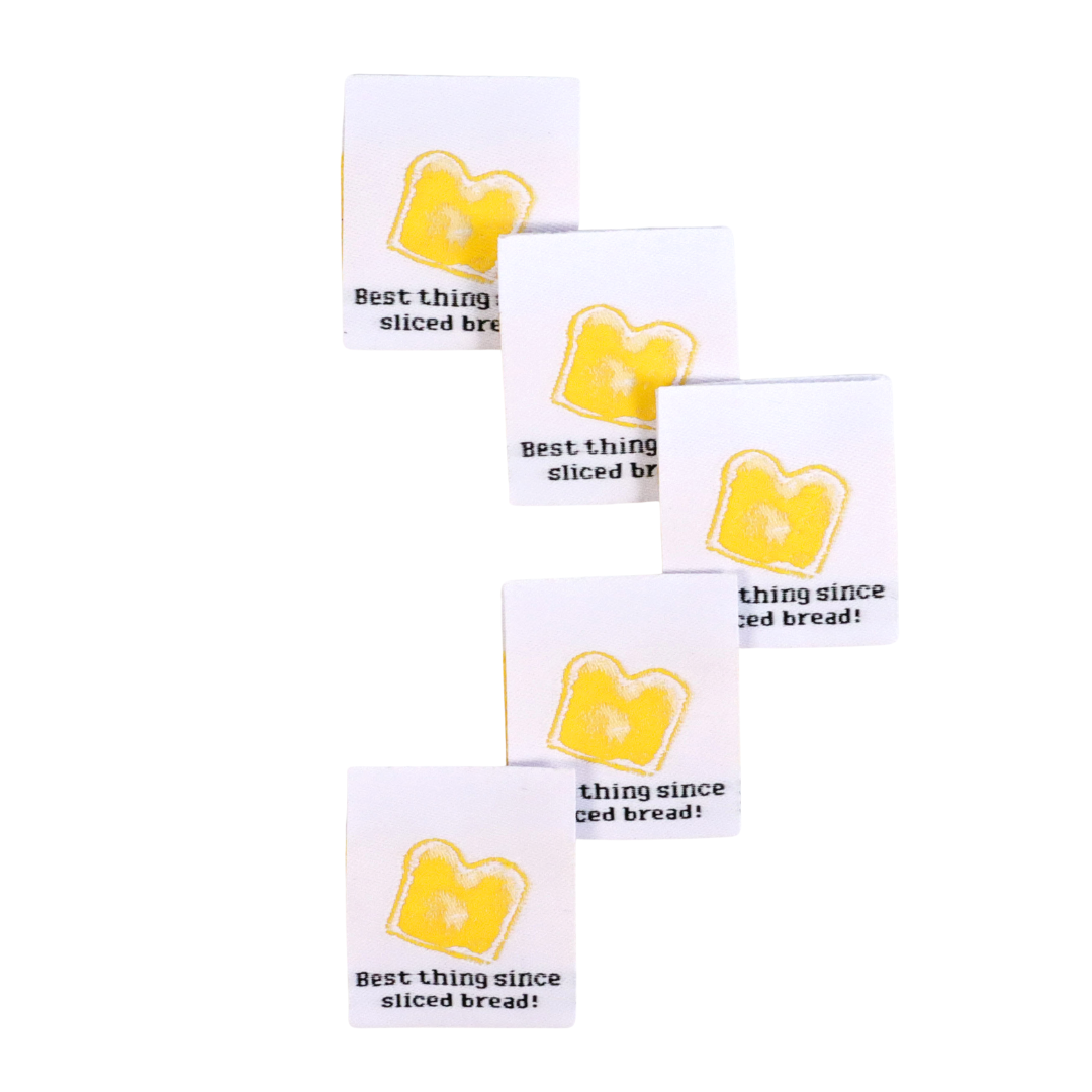 5 pack of white woven labels that say, "Best thing since slice bread!" with a woven image of buttered toast. 🍞